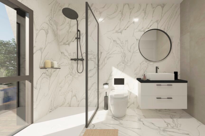Cada villa ofrece tres amplios dormitorios y dos elegantes baños, y el dormitorio principal tiene baño en suite y vestidor. Los otros dos dormitorios están equipados con armarios empotrados y todas las habitaciones tienen acceso directo al hermoso jardín, lo que realza la sensación de pertenencia entre el interior y el exterior.