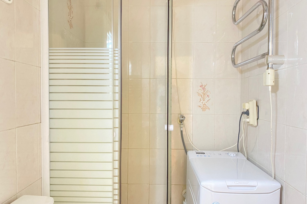 A través del pasillo accedemos al cuarto de baño, el cual está equipado con ducha y en el que encontramos la lavadora.